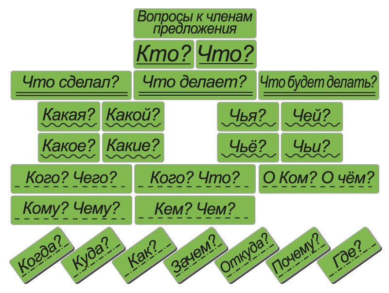 С помощью набора магнитных карточек "Вопросы к членам предложения" ребятам будет легче понять, а учителям проще объяснить разницу между подлежащим и сказуемым, определением, дополнением и обстоятельством.