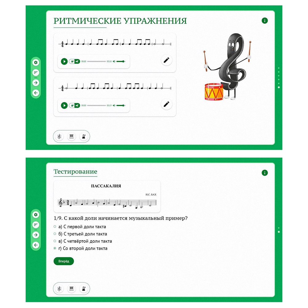 - интерактивные элементы (нотный стан, клавиатура, метроном) и задания;