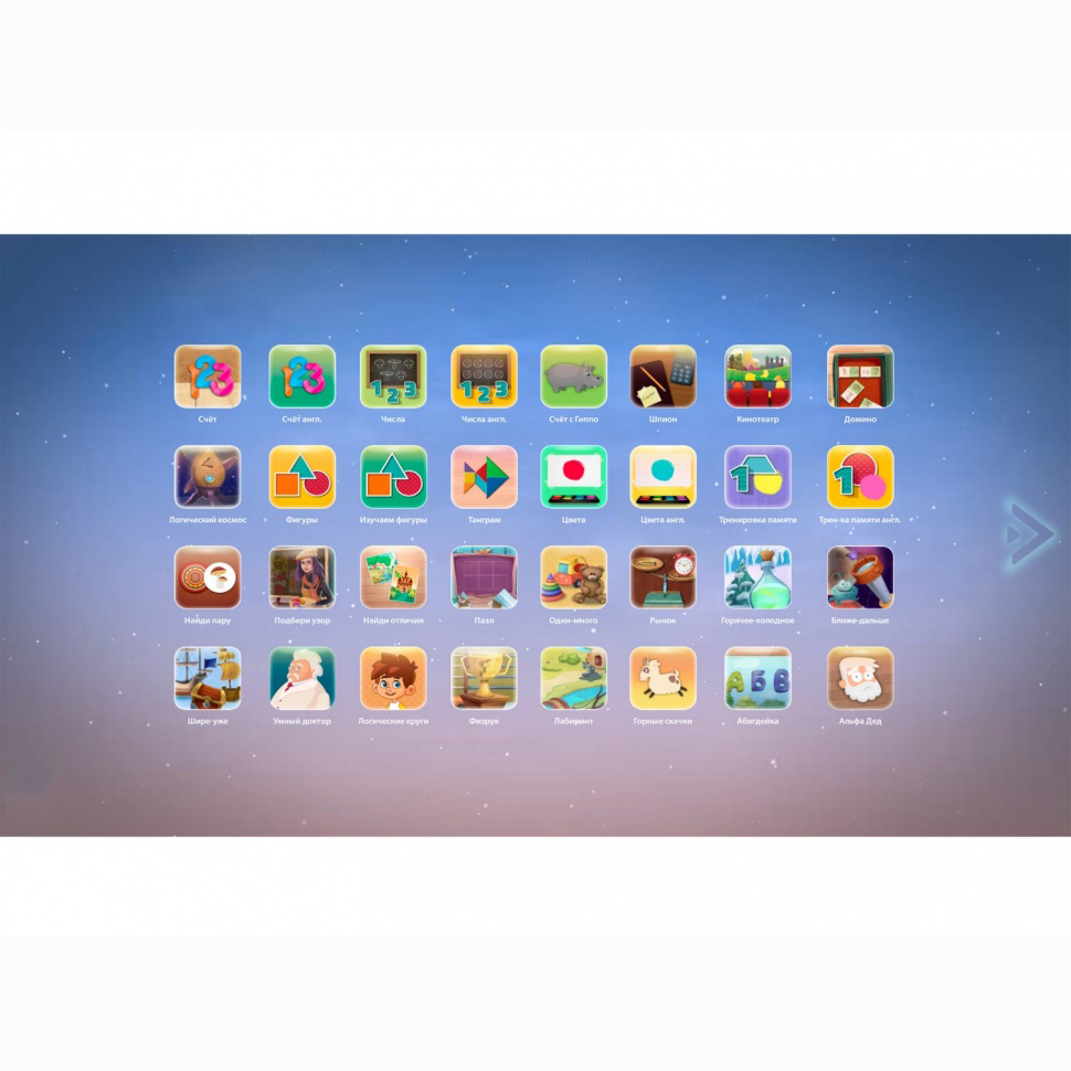Уникальное программное обеспечение, включающее более 80 обучающих игр и 110 тестов, направленных на развитие памяти, внимания, логики, изучение счета и английского языка. Также в программное обеспечение входят приложения: рисование, раскраски, шахматы и шашки. Прохождение всех игр способствует расширению у ребенка знаний об окружающем его мире.