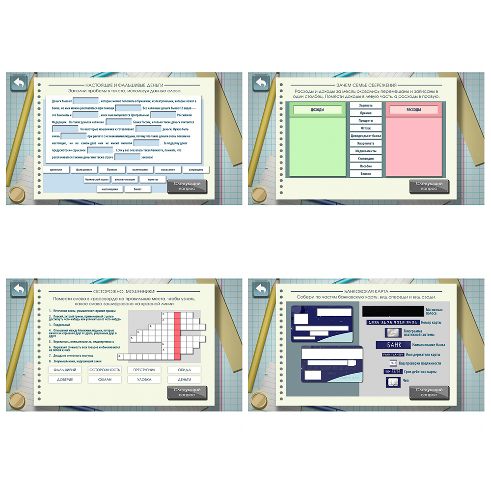 - Основной блок: настоящие и фальшивые деньги, что умеют деньги, своё дело, финансовые риски, семейные накопления, деньги в разных странах.