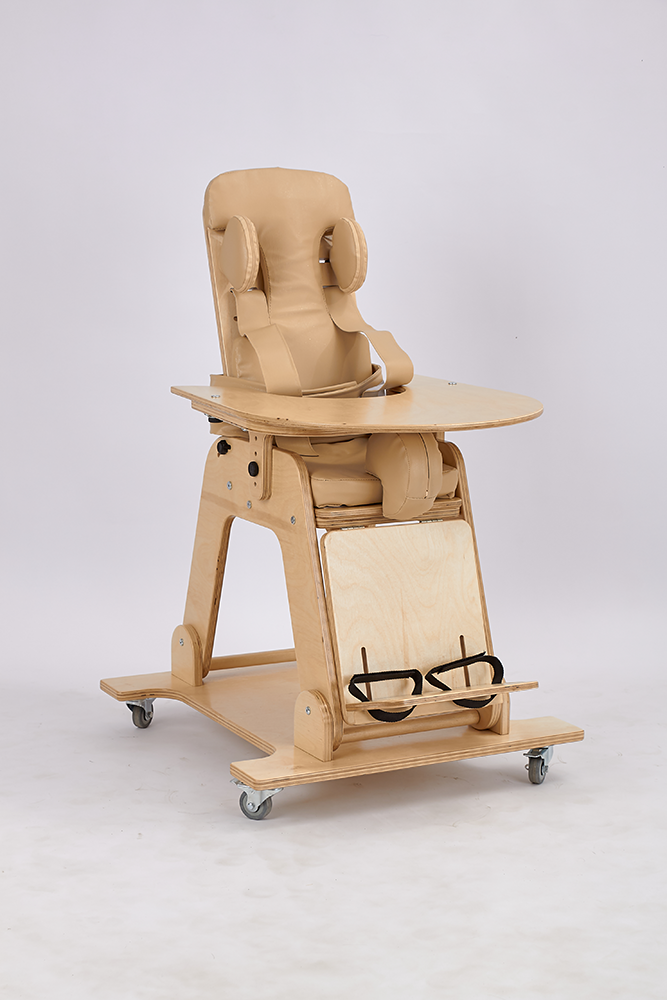 Опора оснащена подлокотниками, абдуктором и фиксаторами головы, а также текстильными элементами для фиксации и мягкое регулируемое сидение. Углы всех элементов опоры закруглены, обеспечивая безопасность эксплуатации опоры. Подлокотники регулируются по высоте в зависимости от особенностей ребенка. Столешница также подвижна для удобства в эксплуатации.