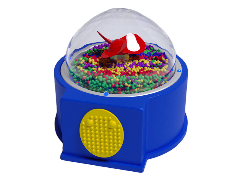 Нажмите на желтый тактильный переключатель. Внутри купола начнут кружиться и мерцать разноцветные блестки. Одновременно с этим будут мигать разноцветные лампочки и играть музыка. Можно также использовать при игре внешний переключатель.