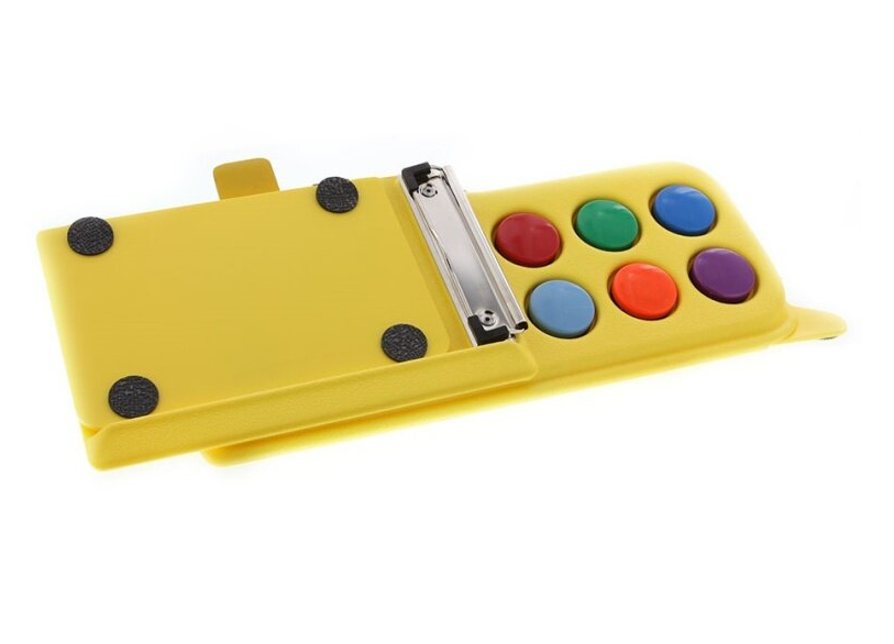 Положите книгу на коммуникатор, закрепите ее. Затем запишите каждую страницу текста, используя для каждой страницы одну из шести встроенных цветных круглых кнопок. Далее пометьте специальной цветной наклейкой каждую страницу в соответствии с цветом той кнопки, которую вы нажимали при записи текста данной страницы. Когда в книге более шести страниц, перейдите на следующий уровень записи. Чтобы прослушать рассказ, ребенку нужно нажать клавишу того цвета, которым отмечена данная страница книги. Сменные наклейки прилагаются.