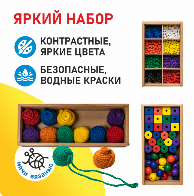 Первые шесть комплектов представляют базовые «дары» немецкого педагога, их использование помогает ребенку усвоить и почувствовать самые важные цвета и формы окружающего мира, а также познакомиться с основными абстрактными понятиями.
