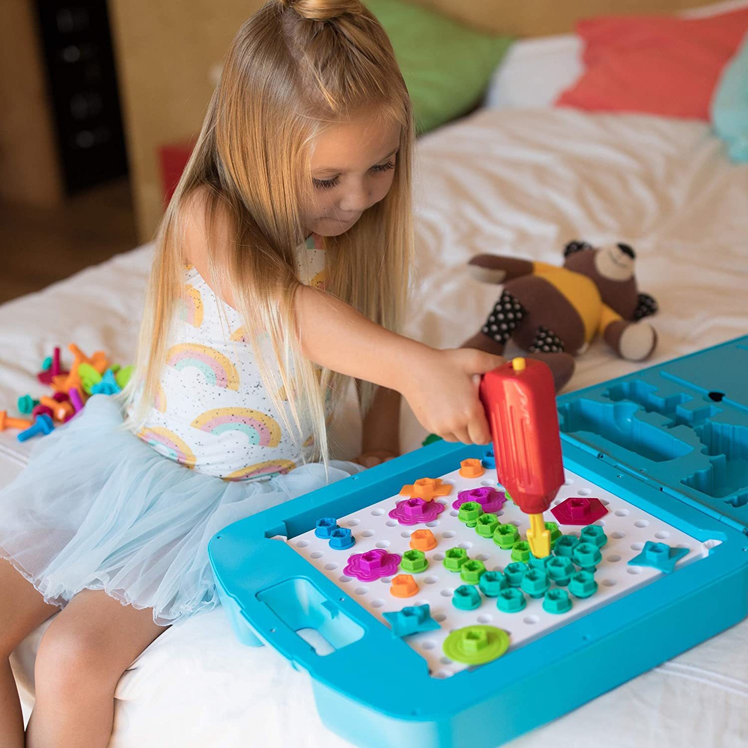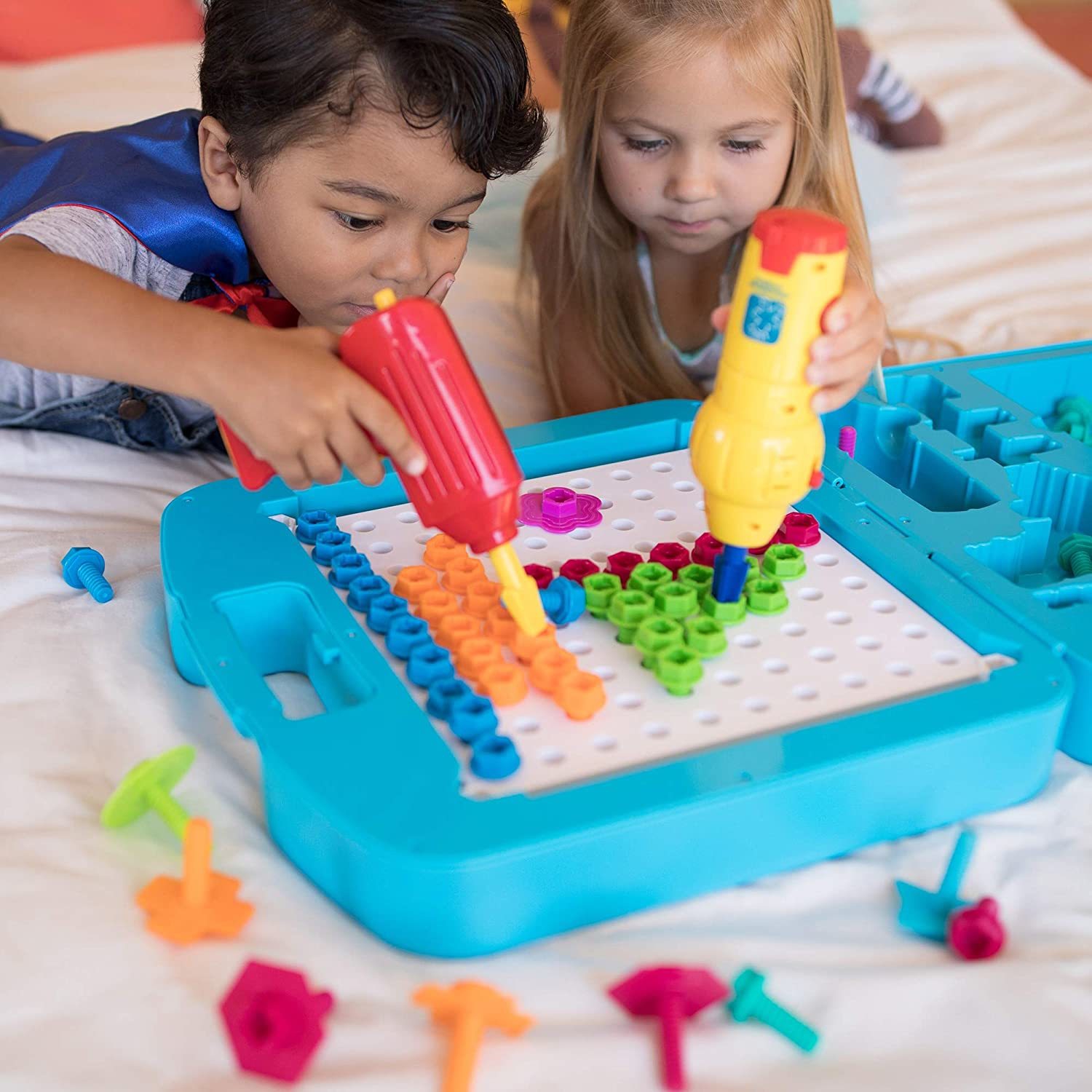 Болты представлены в 5 цветах и представлены в 2 видах. Насыщенные цвета болтиков прекрасно контрастируют с белым фоном рабочей панели, позволяя ребенку сосредоточиться на процессе создания осознанного узора. Постоянное развитие мелкой моторики за счет работы с мелкими деталями.