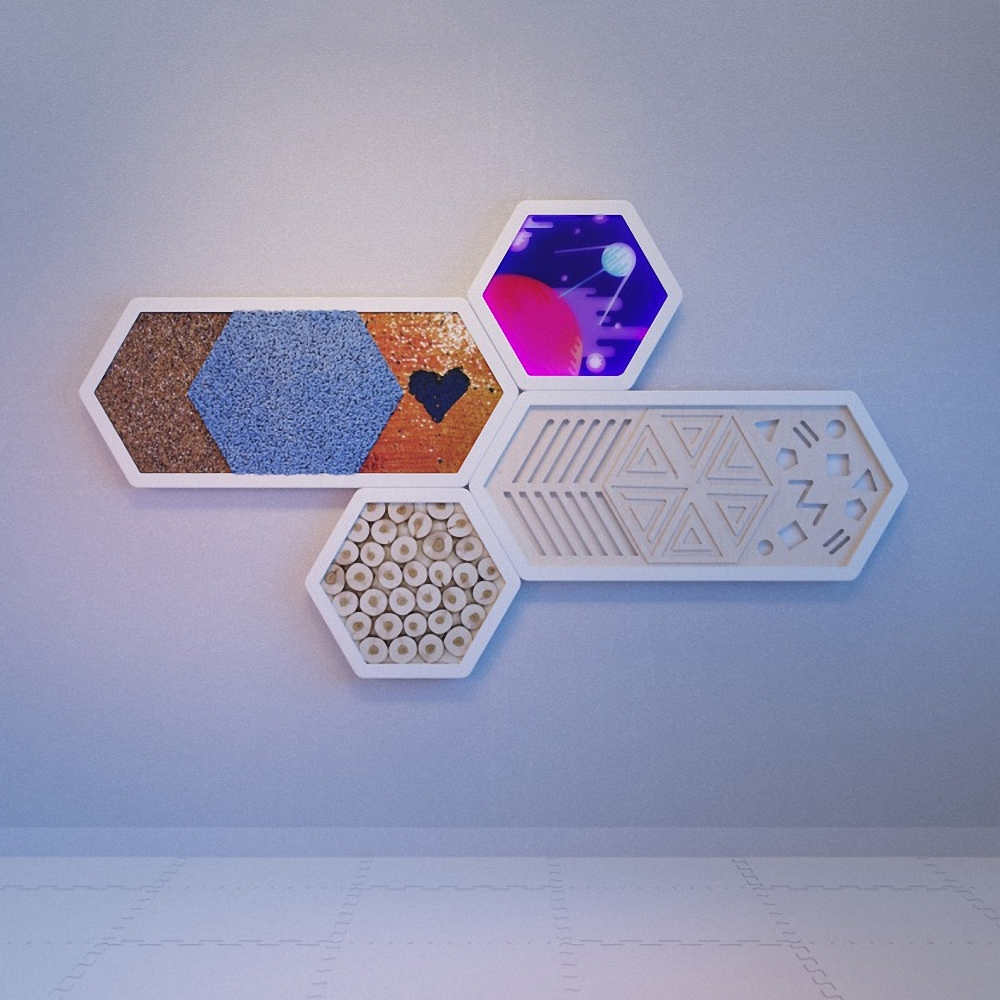 Это декоративные настенные модули, покрытые различными материалами и рельефами, для развития сенсорных систем малышей: зрения, осязания, слуха.