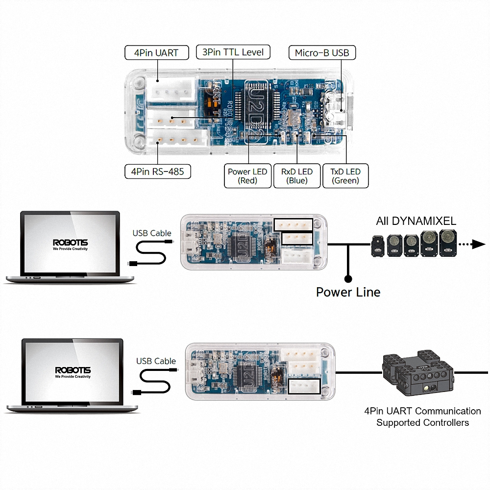 U2D2 может подключаться к 4-pin UART, таких как OpenCM9.04, CM-150 и CM-200 к ПК посредством кабеля USB.