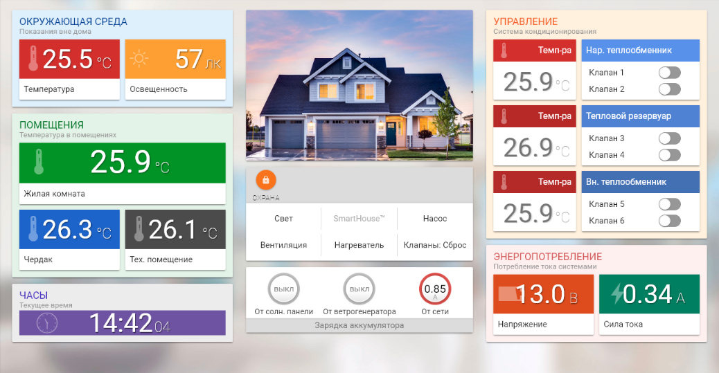 Комплекс поставляется в собранном виде и представляет собой настольную модель дома с жилым модулем и двумя технологическими помещениями, которая позволяет: