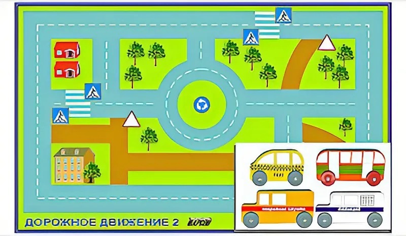 Игровой коврик размером 90*150 см изготовлен из винила, легко сворачивается в рулон для хранения и транспортировки, а также легко разворачивается в рабочее положение. Имеет полноцветное тематическое изображение для организации сюжетно-ролевых игр на темы "Транспорт", "Дорожное движение", "Путешествия". Транспортные средства изготовлены из фанеры, оформлены самоклеющейся пленкой с полноцветной печатью.