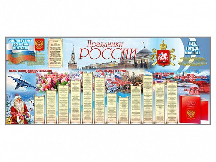 Настенное полотно представляет собой виниловую ткань, на которой размещена информация о праздниках России, а также о флаге, гербе и гимне Российской Федерации и гербе города Москвы.