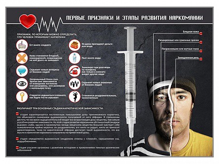 Стенд представляет собой панель, на которой размещена информация о признаках и этапах развития наркомании.