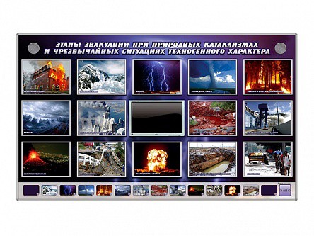 Электрифицированный стенд-тренажер представляет собой информационную панель с раздельной секционной световой индикацией. На стенде размещены секции с названиями основных разделов по теме "Природные катаклизмы и ЧС техногенного характера". В конструкции учебного оборудования интегрирован сенсорный  ЖК-дисплей 19", на котором отображается обучающий материал.