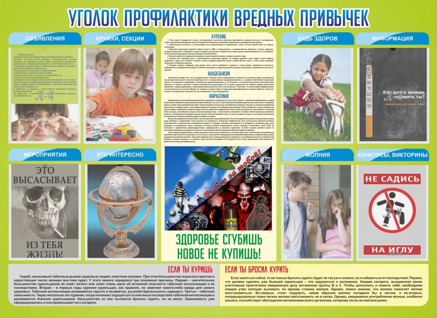 У каждого из нас хотя бы раз в жизни был соблазн попробовать покурить сигарету или попробовать наркотики. Хорошо, если есть сила воли удержаться от соблазна, а если нет. Тогда рано или поздно придется выбирать тропинку вверх или тропинку вниз по шкале здоровья. Этот стенд показывает в лаконичной форме последствия влияния пагубных привычек и нездорового образа жизни на человека и его будущих детей. Информация построена на противоположностях, что обычно имеет лучший эффект, чем простое толкование только слов и фраз «нельзя».