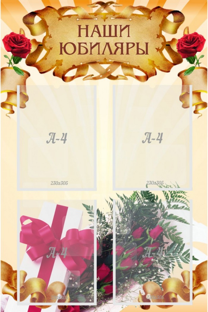 Очень важно в любом коллективе поднимать боевой дух сотрудников или же просто поощрять их вниманием. Именно для такого случая и создан стенд «наши юбиляры». Праздничное оформление стенда имеет все необходимые атрибуты дня рождения – это и розы, и ленты, и бантики. Каждому учителю будет приятно увидеть свою фотографию и прочитать теплые слова поздравления. Стенд имеет небольшой размер и вертикальную форму, а яркие цвета привлекут внимание не только самих юбиляров, но и других сотрудников. Четыре кармана для фотографий формата А4, и легкий вес стенда позволят быстро установить его и заполнить секции.