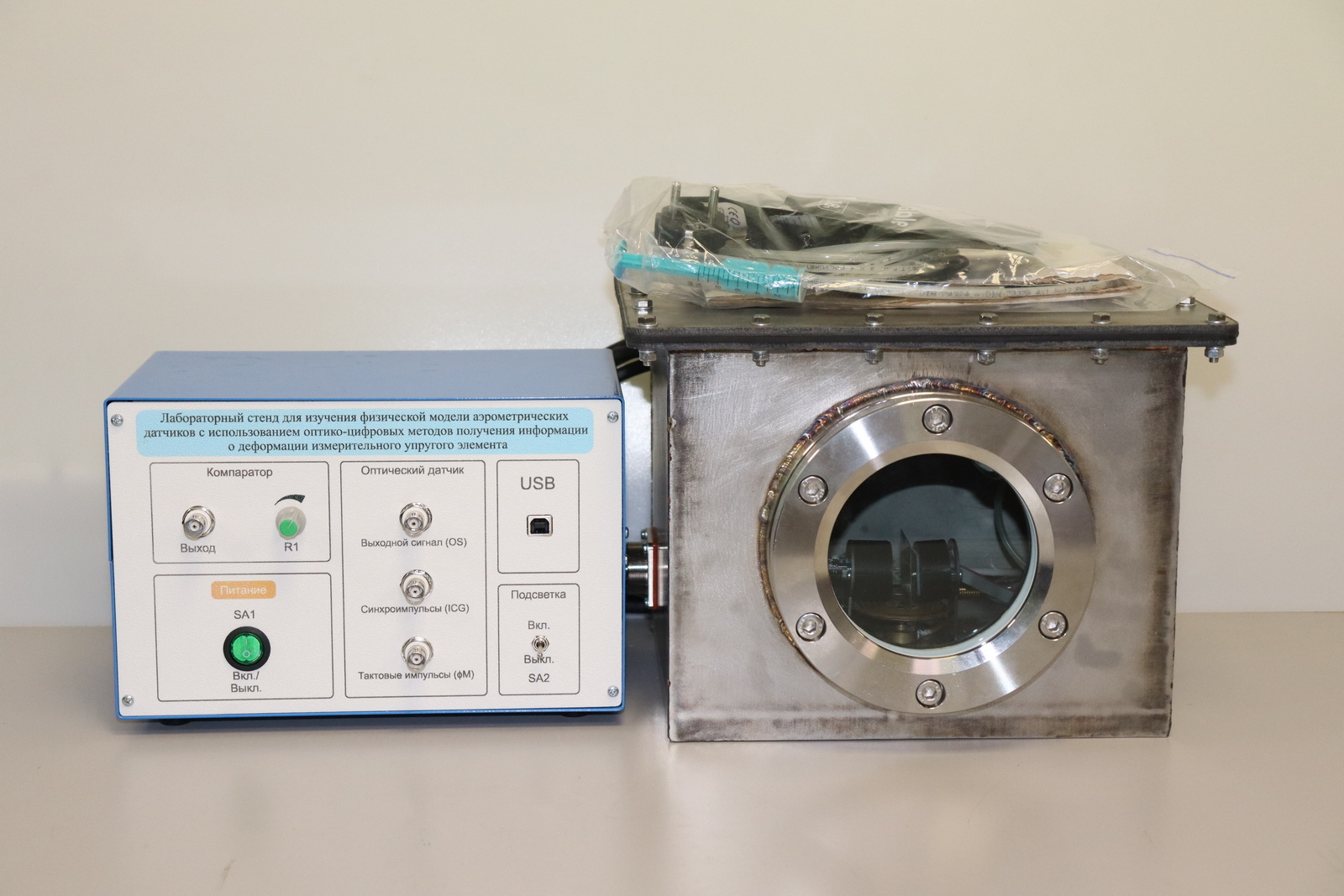 Типовой комплект учебного оборудования "Физическая модель аэрометрического датчика с использованием оптико-цифровых методов получения информации о деформации измерительного упругого элемента" предназначен для изучения принципа измерения деформации упругого элемента с использованием оптико-цифрового преобразователя.