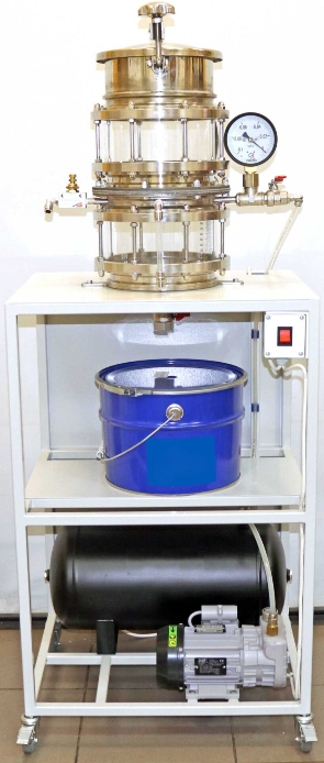 Стенд представляет собой рамное основание, выполненное из металлического профиля покрашенного порошковой краской. Основание имеет поворотные колесные опоры с тормозами. На рамном основании смонтирован вакуумный насос, способный создать разрежение, колба для фильтрации из прозрачного материала, состоящая из двух частей, соединение колбы осуществляется при помощи фланцевого соединения, в нижнюю часть колбы врезаны отводы для слива и подключения вакуумного насоса. Так же в нижней части имеется индикация уровня жидкости, между фланцевым соединением колбы устанавливается перфорированная решетка, фильтрующий элемент и резиновая прокладка, верхняя часть колбы имеет крышку.