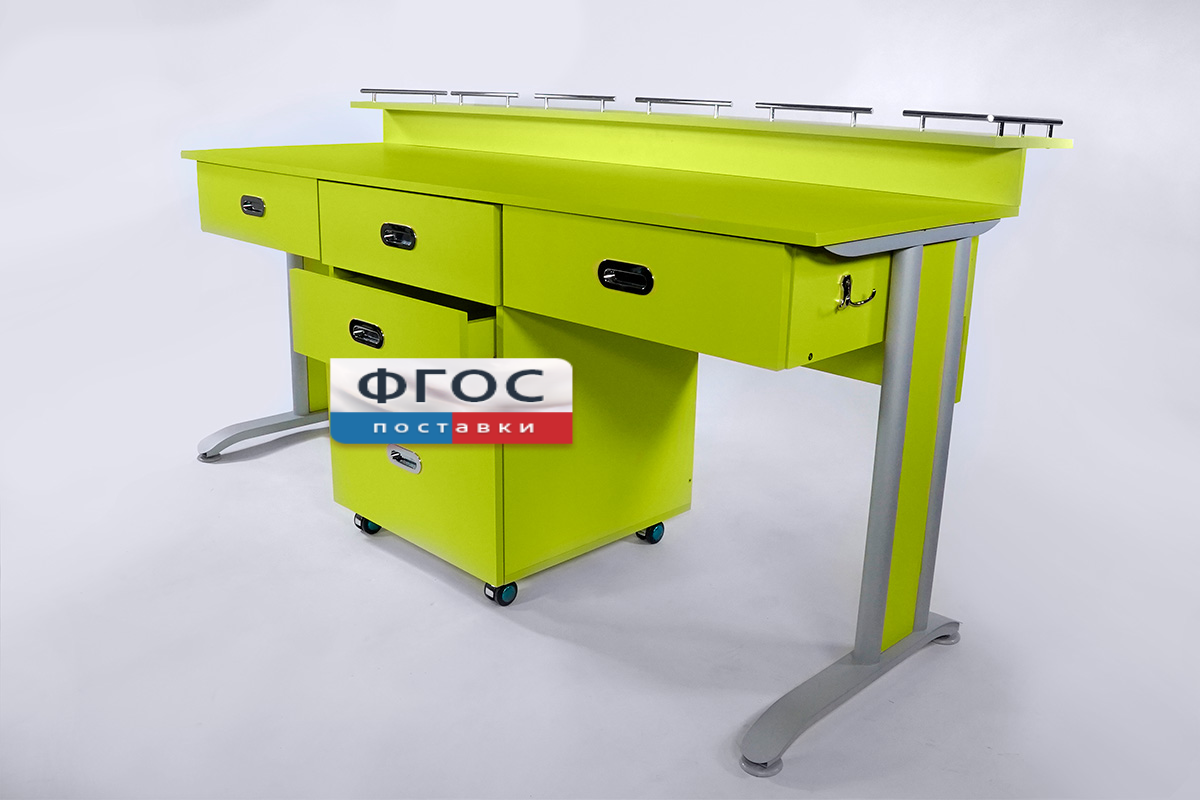 Лабораторный стол с пятью выдвижными ящиками является незаменимым элементом рабочей зоны лаборатории, обеспечивающий удобство и безопасность труда юных исследователей. Основу конструкции стола составляет прочный стальной каркас, выполненный из трубы с порошковой окраской. Каркас имеет боковые вставки из ЛДСП. Столешница изготовлена из материала, обладающего высокой устойчивостью к воздействиям окружающей среды. Периметр столешницы закрыт износоустойчивой кромкой из ПВХ. По бокам стола на металлических каркасах установлены крючки для размещения портфелей и сумок. Стол имеет выдвижную тумбу для установки лабораторного оборудования. Тумба оснащена четырьмя колесиками, что делает ее мобильной и позволяет без труда за считанные секунды увеличить рабочее пространство.