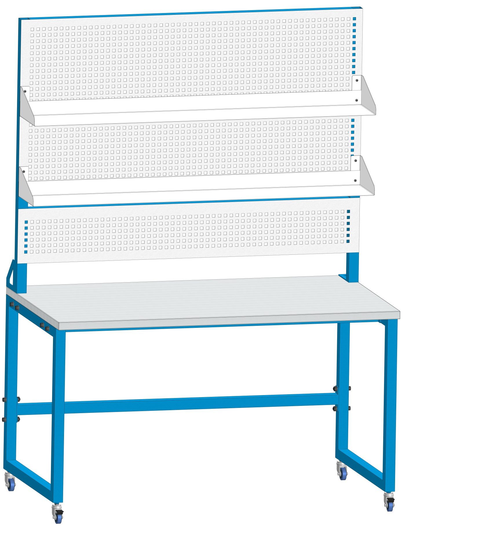 Стойка оснащена двумя полками и навесом со светильником, для освещения рабочей области. Задняя сторона стойки закрыта перфорацией из металла.