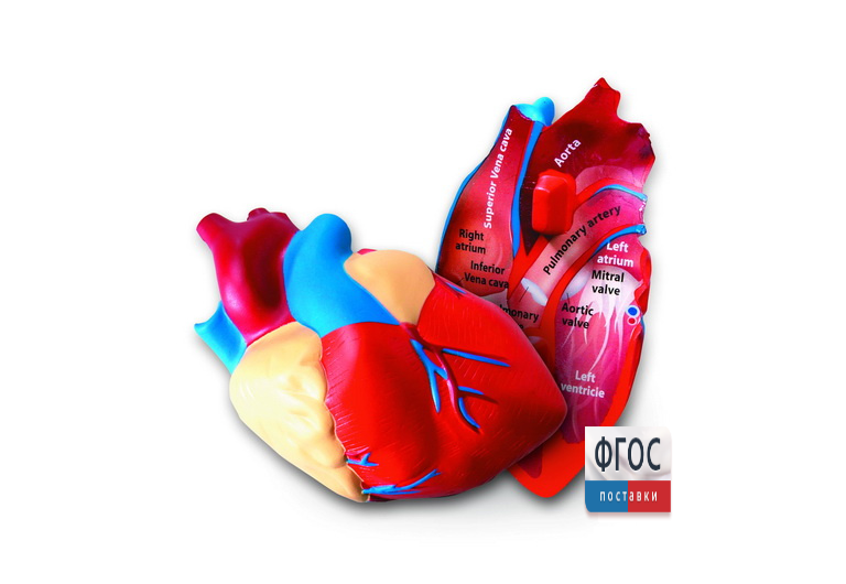 Реалистично подробная пластиковая модель сердца человека разделяется на половинки и в разрезе имеет обозначения органов (на английском языке).